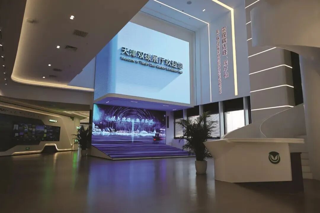 天津经开区精心打造了以环保和可持续发展为主题的天津双碳展厅。步入展厅,前方巨大的3D大屏以震撼的裸眼3D视觉效果,生动展示着天津滨海新区的绿色产业成就:光伏电站在阳光下闪耀,风力发电机叶片缓缓旋转,智慧工厂内的绿色生产线井然有序……让人瞬间沉浸在绿色发展的美好图景中。